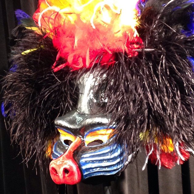 Finished Mandrill Carnival mask. Papier mache, acrylic paint, and ostrich feathers.